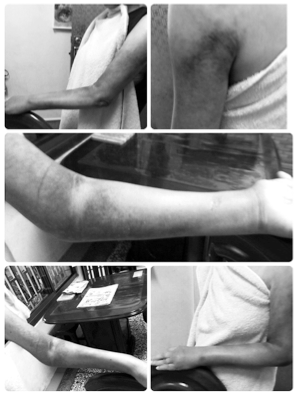 二○一四年6月20日在家里撞伤跌倒痛得站不起来,家人要扶我去医院,我坚持用全光谱疗法来治疗摔伤(因之前烫伤有使用过效果显著),当下请孙女告知宛蓁老师我的摔伤状况,老师很热心地指导用哪些色彩来康复骨折挫伤。额头与膝盖连照了二次就消肿,肩胛骨与后背因皮下血管破裂较广,整只手臂延伸至手指区都淤血,宛蓁老师建议先去照X光,照了X光才知上手臂有骨裂,可是还不需要打钢钉固定,医生表示持续追踪可以回家静养。