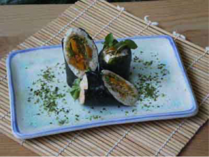 1)全麦吐司面包涂上南瓜酱和味噌,把面包放置在紫菜片上。