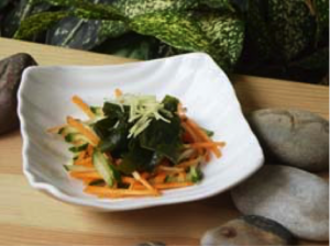 4)将 (1) 滤干水。先加入梅子醋,再加入姜茸、 小黄瓜、红萝卜和小红辣椒或芥末,即可食用。